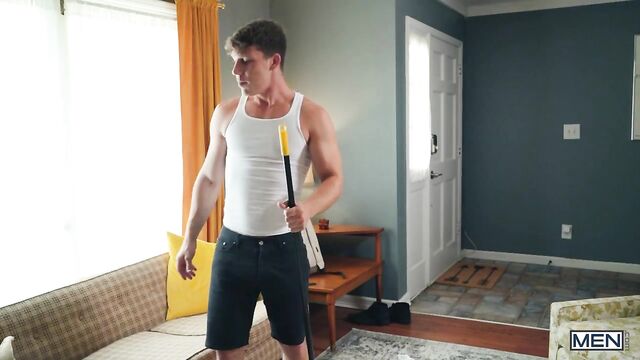 Paul Canon keeps a tidy house, but his new roommate Kaleb Stryker is making that almost impossible! The horny twink won't stop jerking off, leaving his sticky tissues all over the house. Paul confronts the curly haired jerk-offaholic but Kaleb won't stop stroking, cumming all over the floor and leaving it for Paul to clean up. When Paul is bent over, Kaleb decides that he's finally had enough of his own hand and shoves his dick straight up Paul's tight ass. The two feuding friends settle their differences by fucking all over the house, Paul taking Kaleb's thick uncut cock all the way inside of him until he's ready to blow his load all over his own face.