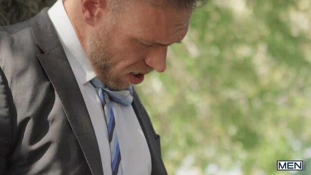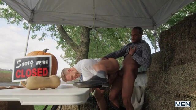 Mayor Alex Mecum storms off after his secret lover Trent King has a little too much fun with an eggplant at the grand opening of the farmers' market. Trent goes after the straight-acting hunk, and Alex proves he's more than a stuffed shirt as Trent sucks his cock behind the hay bales. Trent rims Alex, ripping his pants, so when the public comes looking for their mayor, he has to cover up with a potato sack! Alex gets his revenge by sucking Trent's cock under the table. As soon as they're alone, Trent fucks him doggystyle! The top pounds the mayor against the side of a truck, and Alex orgasms on the country road, then Trent cums in the bottom's hole, the place he belongs!