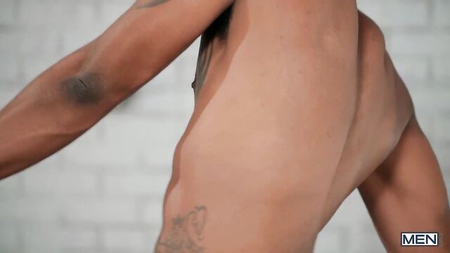 Armond Rizzo and Aaron Reese stare at each other from across a table, the two of them alone in a stark white room where nothing stands between them and everything that they desire. The two sexy men take out their cocks and stroke them, showing off for each other before climbing onto the table to experience each other's bodies for real. Armond strokes Aaron's thick cock, the tall ebony hunk taking the dark-haired bottom's face in his hands for an intense and passionate kiss. Aaron tongues Armond's hole, giving him a long and intimate rim job before giving the small and muscular stud the entire length of his thick cock. Armond loves every second of it, moaning with ecstasy as Aaron dominates his tight hole. Aaron fucks the cum out of Armond before stroking his own massive load out for an amazed Armond.