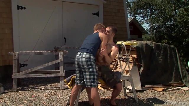 Tony Bishop has the face of an angel and the sexual appetites of a devil. He's a man whoknows what he wants, and he intends to have it. He gets to work on delicious Dylan Hauserat an area of the house that's under construction. Tony's lips and tongue are an unstoppablepower and Dylan has no retreat. Tony tears off Dylan's clothes, fucks Dylan's mouth with histongue, then grabs Dylan's cock and sucks it as if he intends to make a meal out of it. Ballsare next. Dylan's toned, furry torso writhes in the delicious agony of surrender while Tonypresses his sexual agenda. Next is to make Dylan swallow Tony's cock, and what a cock itis: inch after inch of smoothly curved dick, fat at the tip and fatter at the base, with '69'tattooed along the top. Dylan humps Tony's leg while devouring his cock, then takes a breakto slurp Tony's balls into his mouth - first one, then the other, then both together. There'sone more hole to breach, and it's Dylan's ass. Tony advances with his tongue and followswith his cock: a standing fuck on the ladder then missionary style in the wheelbarrow.Dylan's screams rebound across the yard as he and Tony crescendo to simultaneousorgasms.