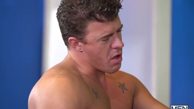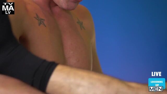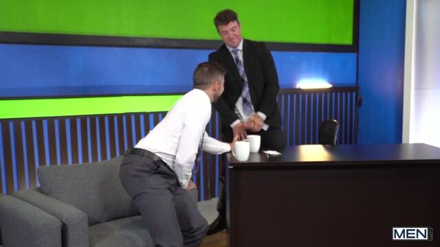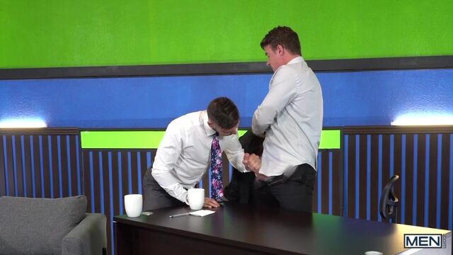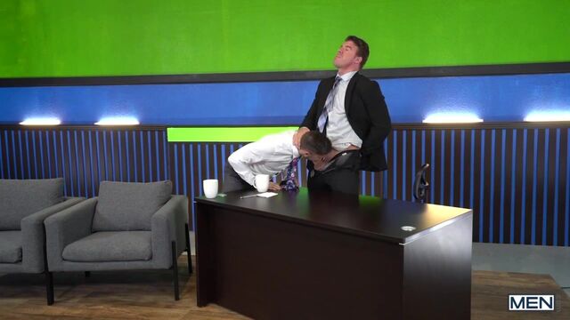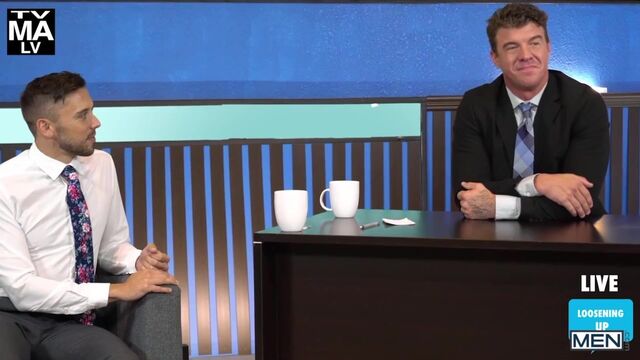 Tall hunk JJ Knight is the host of Primetime, and his ratings have been dropping. He isn’t happy that they moved his show to a later time slot, but he is determined to climb the charts again! His first guest of the night is athletic, cute Shane Jackson, and the only question he wants answered is about the size of the biggest dick he’s ever taken. Brown-haired Shane is a little shy to answer, but horny JJ whips out his massive cock so he can compare, and soon the two are fucking on live T.V! Will the ratings rise as quickly as their hung dicks?