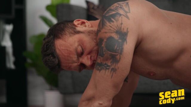 The perfect matched set of muscular hunks, Brock and Sean are equally well matched in their horniness for each other... at least until Sean kicks things up a notch by presenting his big muscle ass to Brock for some attention! Brock spanks that booty and eats Sean's hole before fucking the bottom doggystyle, pounding him in piledriver till Sean cums all over his own face, then shooting his load on Sean's perfect ass. The guys cool down as Sean licks off Brock's cock, then rests his head on Brock's beefy thigh, joking, "Let me just lay on this long pillow you have." But it's not long before they're both ready for round 2!