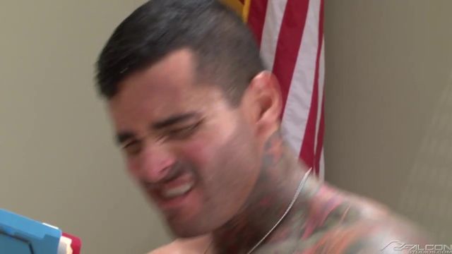 Shane Frost and Alexsander Freitas have been summoned to the commander's office to answer charges that they were caught sucking dick behind the latrines ... charges which they deny. The two soldiers decide that if they're gonna get kicked out for such an infraction, they might as well make the accusations real. Shane gets down to suck his co-conspirator's stiff uncut cock and Alexsander gets so excited he begins to facefuck his slim friend hard. Then the hirsute bodybuilder lays Shane down with his buttcheeks spread wide, exposing his hole so he can rim him, prepping his ass for the fierce fucking he quickly delivers. They fuck non-stop and in different positions until Shane and then Alexsander let loose and shoot their cum all over.