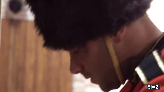It'll take more than being poked and talked dirty to by a slutty tourist like Damon Hart to make decorated member of the British palace guard Billy Essex lose his focus...but when the naughty American gets on his knees and grabs Billy's cock, his body definitely starts reacting. Billy can't concentrate on anything but Damon's mouth sucking his dick, and soon he's bending the impertinent Yank over in his guard booth for a nasty doggystyle shag! As surprised visitors look on, Billy cums all over Damon's face. Rule Brittania!