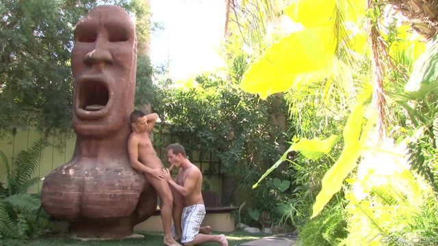 Leaning against the big Tiki god in his tropical garden, Shane Frost's got his hands full as he jerks off. Tyler Andrews walks by and offers a hand, well, rather his mouth. He gets down on his knees and opens up to suck down Shane's cock. Shane can barely contain himself as Tyler knoshes greedily on his dick without coming up for air. Before long Shane gets his chance to repay his buddy in kind and he clamps his lips tight around Tyler's dick. But Tyler wants to feed some more and this time he targets Shane's asshole. He licks and teases the puckered crevice, jabbing a finger inside to prep it for a bigger assault. Tyler then fucks Shane's manhole, pumping it fast and furious until they both shoot their loads.
