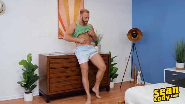 Bearded LA hunk Brogan has a few surprises in store, from his way of meeting new people when he travels to his pierced dick! One of his favorite spots is the beach, and he walks by the water and rides his bike before heading back to the studio. "I'm fuckin' horny. Let's do it!" he announces, stripping off his tank top and shorts and stroking his cock. He slowly and sensually runs his hand up and down the shaft as he kneels on the bed, then fucks the mattress. Brogan teases his hole as he lies back and jacks off, cumming so hard it leaves him breathless!