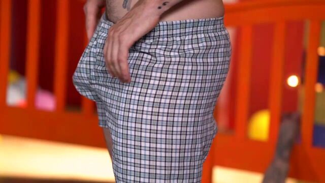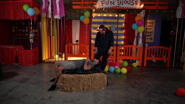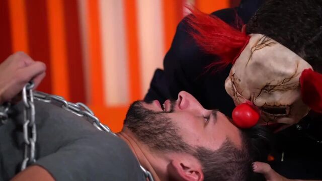 Fit hunk Scott DeMarco is having some weird sexual nightmares about creepy clowns fucking him. Scott is relieved when the clown removes his mask, and muscular, tattooed Buck is revealed. Buck dick slaps Scott in the face before stuffing his thick, long cock in his mouth, and throat fucks him. He bends dark-haired Scott over, and pounds his tight hole.