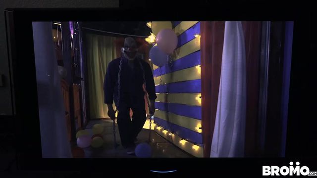 Tattooed hunk Trevor falls asleep while watching a documentary on sexual nightmares, and ends up having one himself! He dreams up a creepy clown and fit stud Pierce Paris. Pierce shoves his crotch in Trevor’s face before stuffing his fat cock in his mouth. He bends dark-haired Trevor over, and demolishes his tight hole.