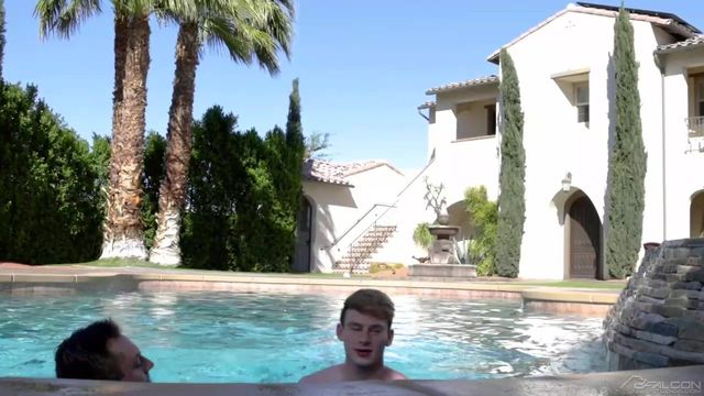 Freckled twink Eric Charming can't resist taking a dip when he sees muscle DILF Damien White lounging in the pool. Wearing his most revealing bathing suit, Eric wastes no time getting into the pool and into Eric's briefs. Now out of the water and on his knees, Eric begins stroking, swallowing, and gagging on Damien's impressive cock. Daddy Damien gives his dick a good shake before inserting it into Eric's hole. Now laying on a lounge chair, the young bottom points his legs to the sky and whimpers as Damien thrusts himself in and out of his smooth ass. A few more bareback pumps into Eric has Damien pulling out his girthy cock to cover the twink's hole in his cum. Still hard as a rock, Damien reenters Eric just in time for the boy to blow his load all over himself.