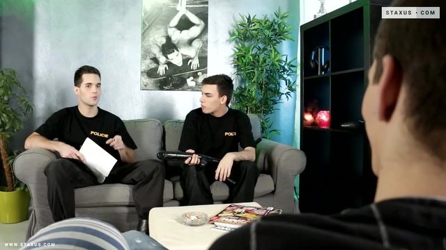 - Description: Tim Law’s hiding something. What’s more, the police are onto his case – which explains why officers Oscar Hart and Sam Williams arrive looking for evidence. Not that they have to look very hard, it has to be said. Before you know it they’ve unearthed a fabulous looking sex-toy and (in response) are performing a strip-search on the youngster.Not that Law’s the kind of boy who’s ever gonna be bothered by this kind of intrusive behaviour; and it’s not long before his day’s taken a whole turn for the better when Hart and Williams turn the full attention of that thick, black dildo onto his butt-hole. Unsurprisingly – given that this is Tim Law we’re talking about here – that sweet little pucker opens up like a flower in spring as a result. Indeed, the fact that his mouth is gagged and his ass is being crudely smacked seems to turn the fellow on more than ever. As a result, everyone’s favourite cock-slut is soon taking inch after fucking inch of rubber; before matters turn ever wilder by Williams fucking both his companions in turn.It’s a move that flicks the temperature to the point of combustion, with Law taking the full brunt of the officers’ hard cocked fury! Indeed, you seriously wonder how this lad will ever sit down again given the pounding he receives at the hand (and dick) of the law! Believe us, he’s banged to within an inch of his rights; and it almost comes as a relief to see the cute-faced beauty get his arse well and truly creamed by both studs in turn. If you can edge the length of this scene without pumping out your own load (or two) then we’ll be feckin’ damned!
