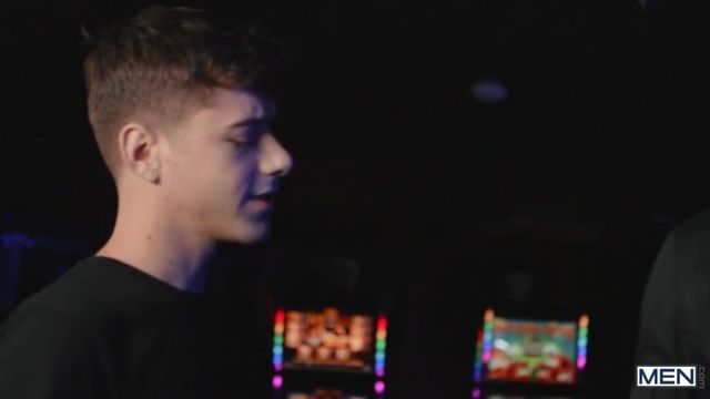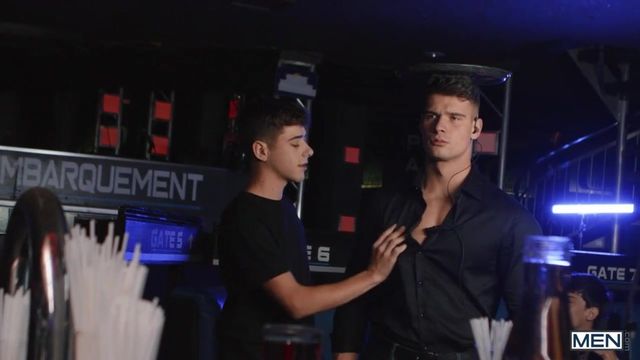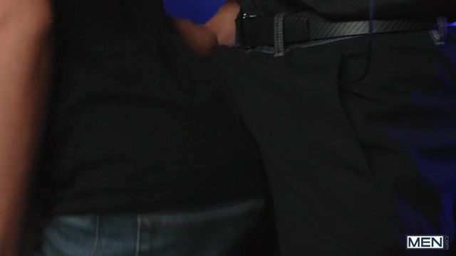 When his client goes to a club for a night out, dedicated bodyguard Malik Delgaty assesses all possible threats, including giving cocktail waiter Joey Mills a very thorough pat-down. The twink enjoys it so much, he does whatever it takes to get Malik's attention again, pulling down the stud's pants and sucking his cock! The head is so good, Malik neglects his duties to pick the bottom up for an upside-down bj, then fingers his hole and fucks him doggystyle. Joey rides the top, then cums as Malik pounds him on a table before taking the muscular hunk's load on his face.