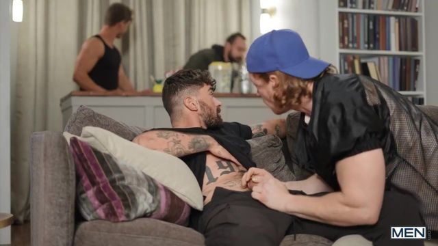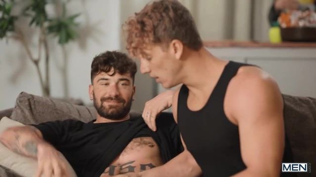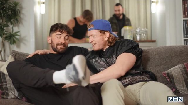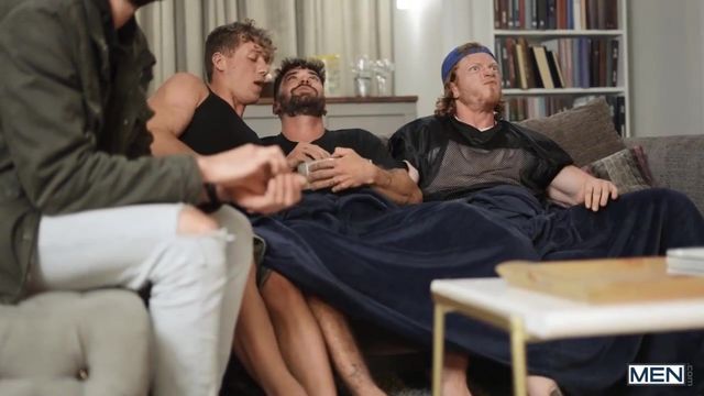 Felix Fox and Chris Damned are watching the big game with their couple friends Kyle Connors and his boyfriend, but when their other halves go to get some snacks at half time, Kyle starts hitting on Chris behind their backs! Felix catches Kyle sucking Chris's cock and shows the interloper how it's done, then Chris sneakily rims Felix. When Kyle's boyfriend returns with the food, the three horny dudes hide under the blanket as Kyle and Felix vie for who will jack off Chris. Kyle's boyfriend makes a trip to the store, and Kyle steals another taste of Chris's cock before sucking Felix as Felix rides his bf. Then Felix sucks Kyle as Chris pounds him doggystyle, and Kyle jacks off as he watches Felix get fucked till the bottom gets covered with all three loads!