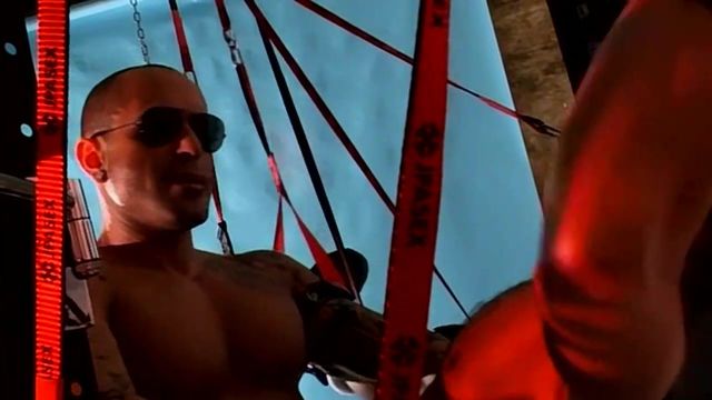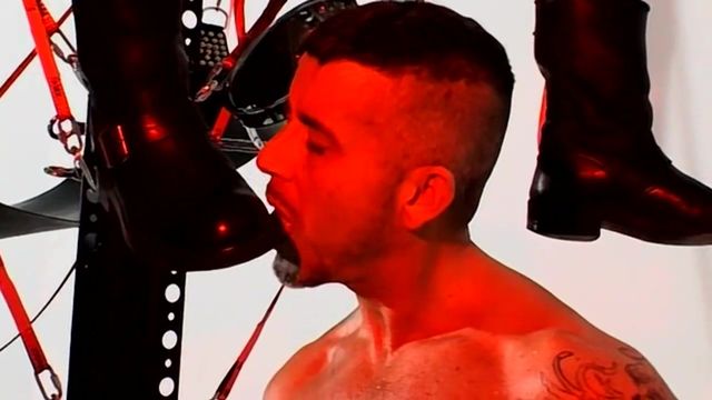 Muscular leather studs have some exciting bondage equipment to play with, so they're horned up and ready to go at it.The bottom is bound, standing with his ass out, and the top spanks and rims him to get they both hot. They fuck all over the equipment, doggy and missionary, before the bottom gets cum all over his face and jerks off himself!