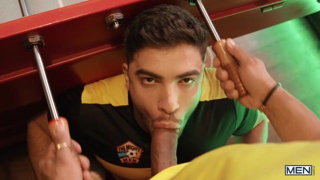 Watching their soccer team's victory makes futbol fans Alejo Ospina and Daniel Montoya so excited, they kiss each other. As Alejo's buddy takes him over to the foosball table, he keeps making hot eye contact with the sexy fellow fan, and Daniel sneaks over and sucks him under the table! The guys suck each other, and Alejo rims Daniel, then slides a foosball handle into his hole before fucking him doggystyle. Daniel rides the top's dick, then Alejo pounds him on a bench in missionary. Daniel rides the top reverse, stroking his cock till he cums, then gets on his knees to take Alejo's load in his mouth. GOAL!