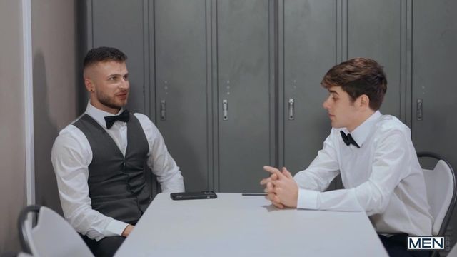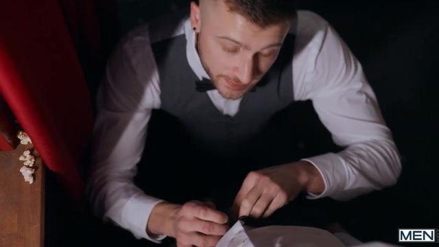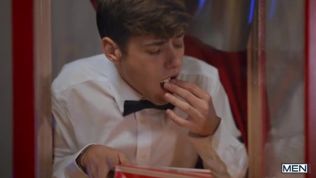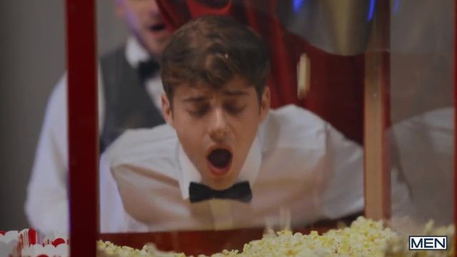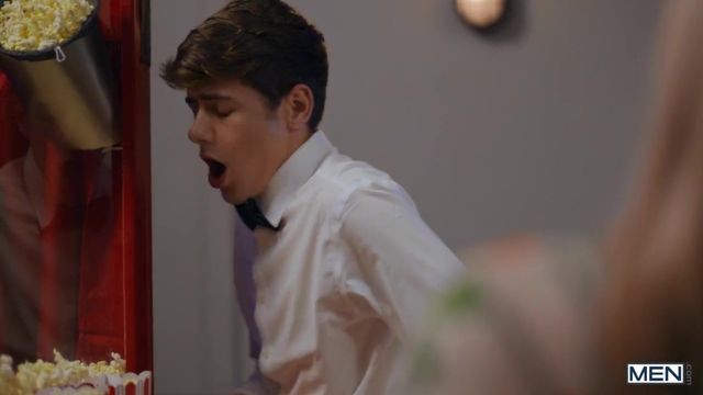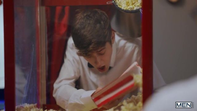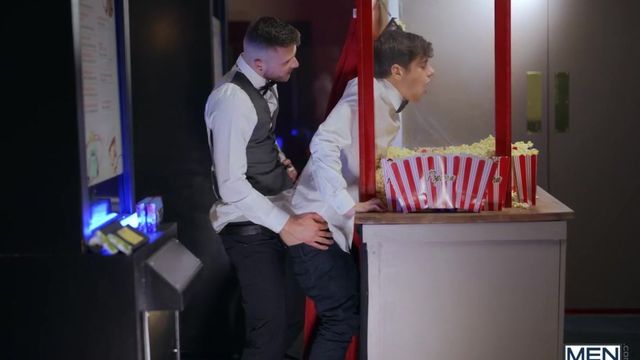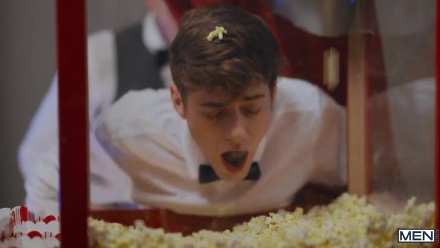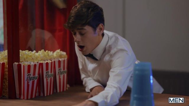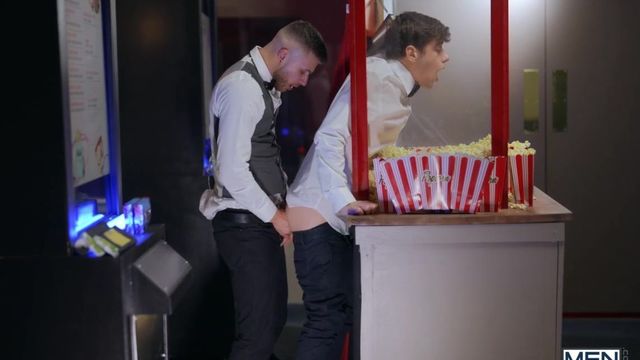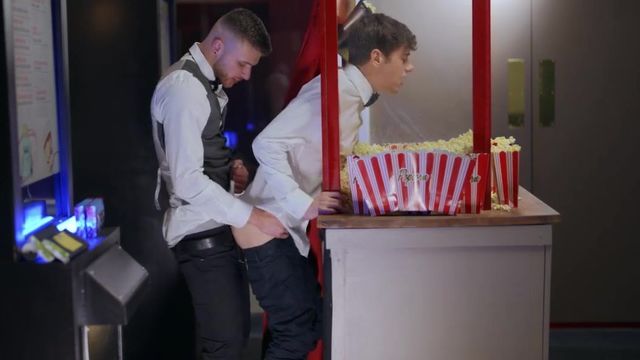 It's Joey Mills' first day working concessions, and he immediately flirts with his new coworker, Devy, holding his hand for a long time as he gives him seductive looks till Devy has to do something about it. Joey does his best to serve customers as Devy blows him and rims him under the counter, but when the lobby clears out, the guys take their chance to fuck! Devy pounds Joey doggystyle, then the twink lies back over the counter and sucks Devy's cock. After Joey fucks Devy's face, they hop up on the counter where he rides the top reverse till he orgasms, then Devy fucks him doggystyle till he shoots his hot "butter" on some popcorn.