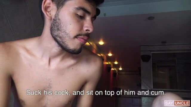 On a gray, rainy day like this, I never expect to find a smoking hot stud like the one I come across today. This twunk has a package that makes my mouth water, so I offer him some shelter and a couple of bucks to show me what he’s working with. He unveils his rod, and just as I expected it’s thick and beautiful. He’s so fucking hot that I just need to watch him fuck my little buddy’s tight asshole. I call the cute boy over and he licks and slobbers and rides the guy’s boner before drinking a mouthful of his warm leche.