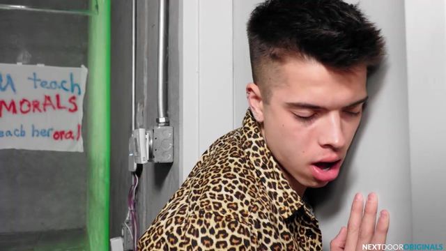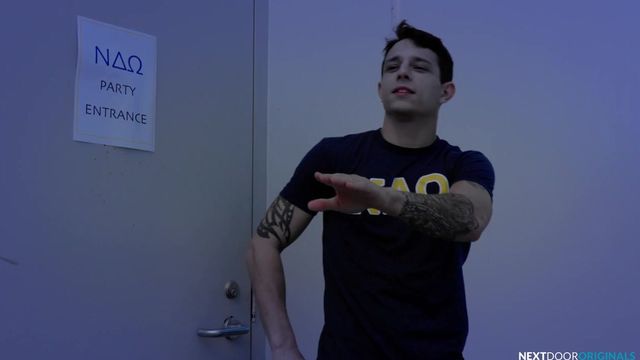 Kyle Wyncrest is on doorman duty at the frat's big Friday party. When pledge Evan Knoxx shows up without the requisite two hot girls in tow, Kyle suggests Evan earn entry in a hornier way.