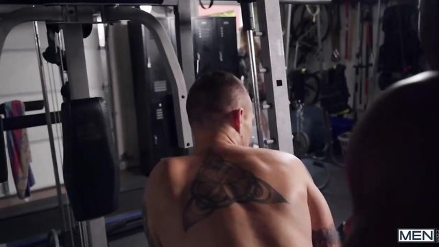 Tattooed hottie Cody Smith wishes he could get naturally swole, so when his mom's muscular ebony personal trainer, DeAngelo Jackson, offers him a free session, he jumps at the chance. DeAngelo starts out working Cody's glutes, and then bench-presses his entire body to show what he's can look forward to if he keeps training with him! DeAngelo offers lots more free sessions if Cody hooks him up, telling the hot bottom to lick his armpit and then suck his cock. DeAngelo fingers Cody's tight ass, then fucks him doggystyle while getting in some reps with the free weights too. Then these guys give their forearms a workout by jacking their cocks till they cum.