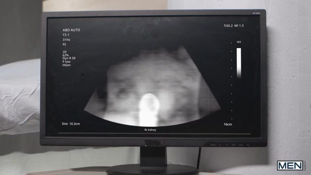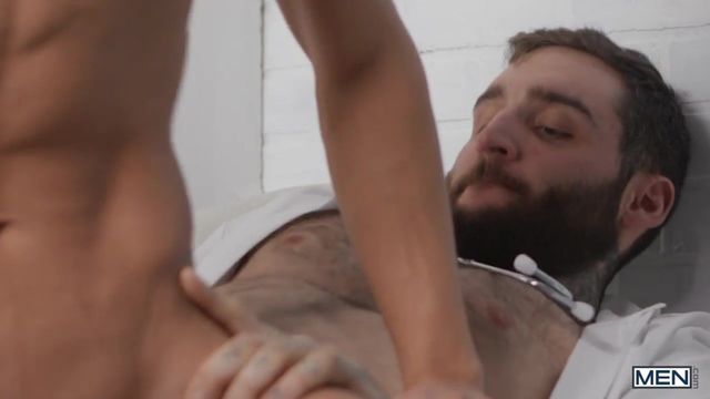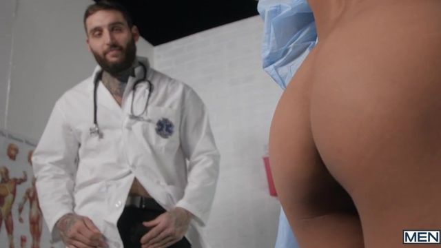 Dr. Tony D'Angelo is peeking through the gloryhole he found, watching the nurses fucking in the next room, when his next patient, Dane Jaxson, comes in and catches him with a stiffy! Tony decides to skip straight to the prostate exam, and Dane moans as the sexy doctor fingers his hole, telling him to go even deeper. Tony is happy to oblige, fucking Dane in missionary and even using the ultrasound so he can see his cock moving in and out of him! Tony does an oral exam, penetrating Dane's mouth, then fucks him doggystyle. The bottom rides the doc, stroking himself till he cums, then takes an injection of jizz in his hole!