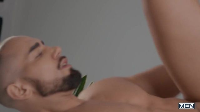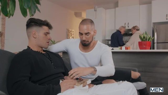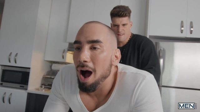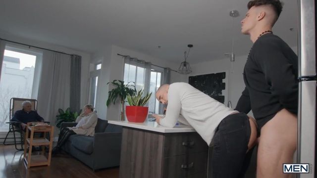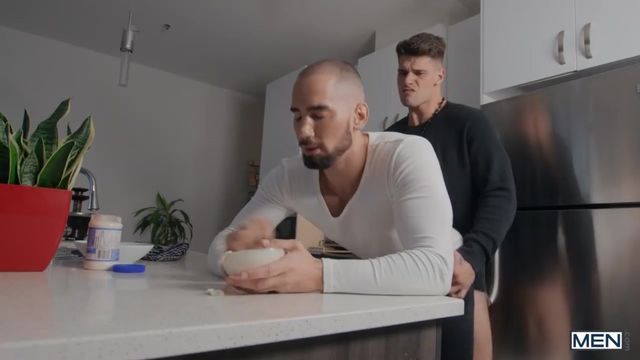 Tayler Tash's parents have prepared a nice lunch and a special chocolate fountain for their first meeting with their son's new boyfriend, Malik Delgaty. Polite Malik brings some flowers and chocolates... but this assortment has a very special tidbit, as he cut a hole in the box and sticks his cock through! Tayler gives Malik a sneaky bj, then Malik follows his man to the kitchen and fucks his hole! Malik and Tayler get naked and the bottom rides the hunky top reverse, then Tayler bends over the counter in the kitchen to get his hole pounded hard. Tayler orgasms as Malik penetrates him in missionary on the counter, then gets to his knees to take his man's hot load on his face. Time for dessert: Malik dips his balls in the chocolate fountain, and Tayler licks it off!