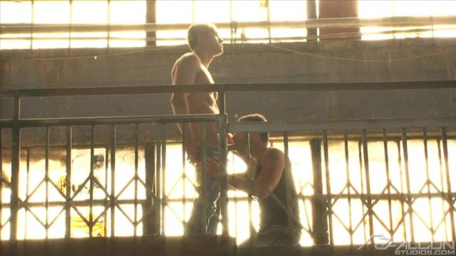 Steven Daigle wanders inside the warehouse looking for trouble and finds big-muscled Erik Rhodes. The two men face off and quickly let their hands and tongues do all the talking. Steven is all over Erik's cock, savoring the foreskin's fleshy excess. Then it's the big man's turn to service his wanton comrade. Steven next zeroes in on Erik's bubblebutt, diving tongue-first into the clenched aperture. Erik responds in kind, priming his opponent's hole before he drives his dick in. Steven grows excited with each fierce thrust, even during his bouncy ride on Erik's hot rod. They finish off with Steven on his knees jerking himself off while he fellates Erik's big sausage. The young buck cums first and creams all over. He quietly waits as Erik showers him with his spooge and then he takes off.Wanting more, Erik kinks it up. He grabs a traffic cone, squats over it, opens up and slides down. His sphincter stretches wide as it eats up the pillon, exciting him to a second gooey ejaculation.
