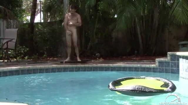 Joe Parker is out for his morning walk when he discovers he is being watched by a very hot man. Not the type to be shy, Joe entices his voyeur to follow him as he heads back to his pool for an outdoor shower and jack off session. He takes his time as he lets the shower water cascade over every inch of his defined hairy body. Soon, his hands wander to his massive cock and in no time it is standing up to its full 9' of glory. Once fully aroused, he jumps into the pool to lounge on his float as he continues to stroke his massive cock. The combination of knowing he is being watched and the afternoon heat soon send him over the edge as he shoots a nice big load all over his stomach.