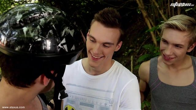 Prague, like most big cities, can be a rather confusing place for those who don’t know its streets and parks, so it’s probably not too surprising that Johny Cruz and Sven Laarson should get completely lost whilst out on their deliveries. It’s just as well, therefore, that this intrepid bicycling duo is fortunate enough to encounter none other than home-boy Mike James, who’s only too willing, able and eager to point them exactly in the right direction – namely to that thick, meaty, uncut ramrod that he’s got stashed inside his pants!Indeed, it’s pretty much no time at all before all thought of the postal service has been utterly eradicated from their minds, as this trio of hot, horny cock-suckers engage in an impromptu open-air suck-a-thon that’ll quite literally leave you gasping and begging for more. It’s clearly all a little too much for Cruz, that’s for sure. Soon this filthy-minded fucker is laid out on the woodland floor, with his legs akimbo, having his horny little pucker eagerly rimmed by his buddies; before James puts him out of his misery and skewers his ass head-on with his handsome raw knob!This act of apparent kindness, however, is but the introduction of some of the hottest, raunchiest action you’re ever likely to see; culminating in Cruz getting double-dicked by his domineering pals, prior to being sprayed with a cascade of creamy nut-juice as a reward for all his efforts. Little wonder the young fellow is hyped into a sticky crescendo of his own – as, no doubt, will his legion of fans!