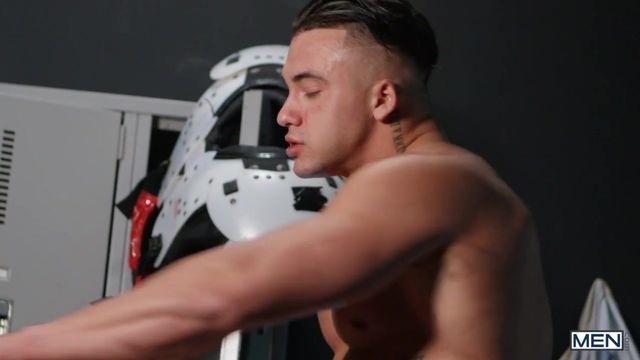 As musclebound bodybuilder Phillipe Massa strips down and towels off the sweat from his ripped chest after his workout, he's joined in the locker room by blue-eyed twink Benjamin Blue. Benjamin catches the top checking him out and indulges his desire to touch Phillipe's big muscles. Wordlessly, Benjamin strokes Phillipe's chest and takes out his big cock, then sucks it! Phillipe fucks the bottom doggystyle, then piledriver on the floor. Benjamin lies back on the bench to get his hole pounded, stroking himself till he orgasms on Phillipe's abs as the top pumps him full of cum!
