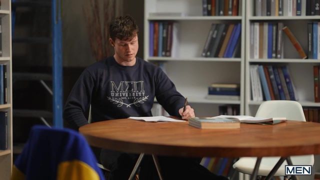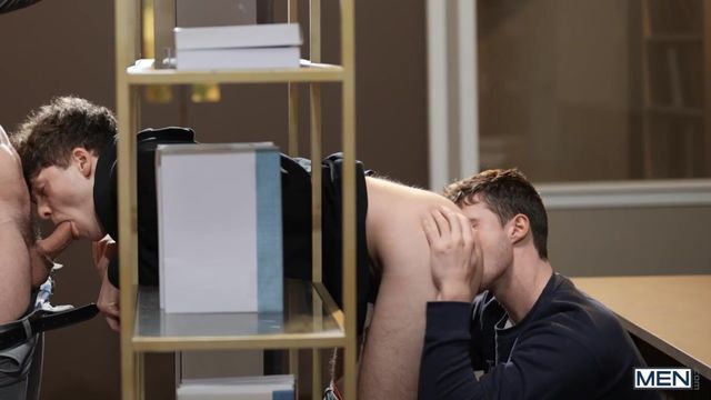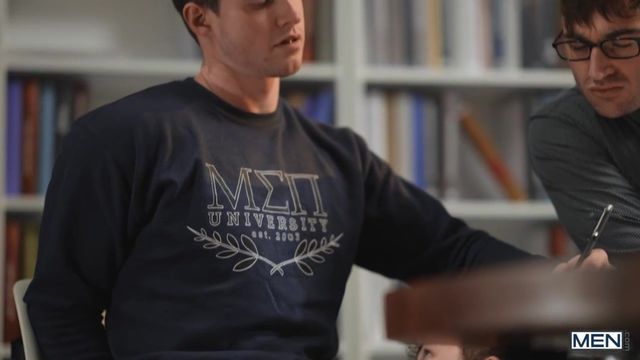 Professor Michael Boston is giving his favorite hunky student Finn Harding some extra study help in the library when twink Troye Dean runs in and hides under the table, closely followed by the jock he just pranked. As Michael tries to send the angry guy away, Troye pulls Finn's cock out and sucks it! When Michael returns, Finn's having trouble concentrating on the math problems, so Michael encourages him with a kiss. After Troye gets roughed up by his bully, the kind prof comes to help, and Troye sucks him too! Finn decides to use that ass, rimming and then fucking Troye's hole before he and Michael switch places. Michael wants to get fucked too, so Finn pounds him doggystyle, then fucks both the professor and the twink missionary on a table before Michael and Finn cover Troye's face with their loads.