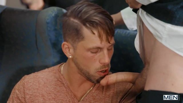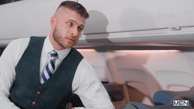 Flight attendant Devy sees first class passenger Roman Todd checking him out and asks if there's anything he can take care of for him, so Roman takes out his cock! Devy has to go help a demanding passenger, but eagerly returns to suck Roman's dick, then rim him in the aisle. Roman wants the steward's dick in his hole, and Devy brings his cock in for a doggystyle landing, then Roman rides him reverse in his seat. The bottom cums as he gets pounded in missionary, then Devy pulls out to blow his load on Roman's abs!