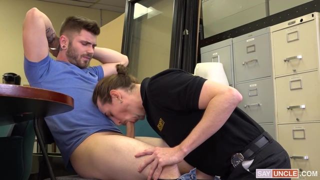 Security officer Jack Hunter brings hot young perp Tyler Castle to the back room to confront him. Jack says he’ll call the police to get him arrested, or he could choose to become his sexual slave. Tyler protests saying that he’s not gay, but it doesn’t take much to convince him and he ends up destroying Jack’s hole with his huge cock!
