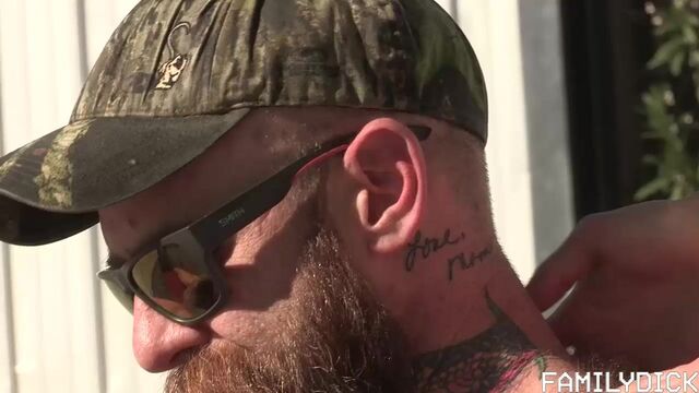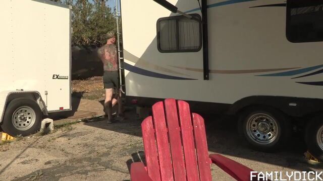 When daring Dylan’s tatted stepdaddy asks him to rub some oil on his strong body, the little guy suggests that the old man fuck him right there in the middle of the trailer park! The big guy is afraid someone will catch them, but the boy reassures him that it will all be their little secret. The old man stuffs his giant dick in his stepson’s mouth, making him choke and gasp for air as his head bobs up and down. Then, he penetrates the kid’s tight asshole, giving him a bareback anal drilling. The boy loves it so much, he shoots a huge load all over the ground while the old man strokes!