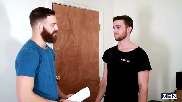 Building manager, Tommy Defendi, comes to let Brandon Moore know that he has been evicted from his fuck pad before he has even had a chance to fuck in it. Brandon is reasonable in asking Tommy if he would just help him get one good, hard fuck in. Brandon swallows Tommy’s massive cock while working his beautiful balls. He then sits on Tommy’s hard dick, bouncing on it, and riding it like a champion. Brandon then has his ass slammed while his face is planted on the bed.