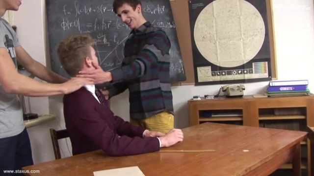 Some people have a natural talent at maintaining discipline in the classroom, but it’s clear from the start that fresh-faced, curly-haired Lucius York is not one of those individuals. Left in charge of exchange students, Zac Todd and Sven Laarson, he’s quickly outwitted by two scoundrels who are clearly eager to make trouble; and it’s no time at all before he’s lost complete control of the situation.As a result, York is soon the passive player in a terrifically hot schoolroom threesome, as his two “charges” assume the lead by thrusting their thick, uncut dicks in his face. It’s at this point, of course, that he’d be quite entitled to balk. Far from it, however. If anything, the sight of all that meaty flesh sends the fellow onto another level, and before you know it he’s quite literally acting like a bitch on heat – a fellow who’s only objective is to get as much hard dick up his ass as he possibly can! Needless to say, he’s not left disappointed by these two horny fuckers, who promptly proceed to take turns screwing him over a desk in a spit-roasting frenzy!It’s certainly not the kind of disciplined atmosphere that most of us would anticipate, that’s for sure, but we deny any of our fans not to be completely bowled over by what’s a superb performance from all three lads – most notably York, of course, who remains the focal point for all the hardcore testosterone on show. Culminating in him taking two deliciously generous face-shots, whilst working out a wad of his own for a gooey, over-the-top crescendo!