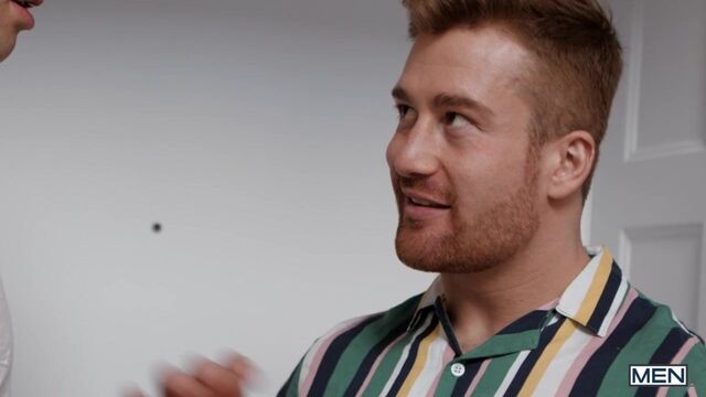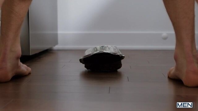 Olivier Robert and his BF have invited over some friends for a fancy brunch, but Olivier wants to get a taste of his guest! When he lets Malik Delgaty in, he sucks his fingers, then starts rubbing Malik's cock under the table. When Malik sees Olivier's booty bent over in front of the fridge, he is too tempted and has to sink his cock inside! They get caught by the other guest, but Malik sends him packing as Olivier lies back on the counter with his legs spread to take the top's cock! Olivier sucks Malik and rims him before bending over the counter for more hard drilling, then rides Malik on the floor. Olivier may have dropped the cake on the floor, but luckily Malik gave him a creampie!
