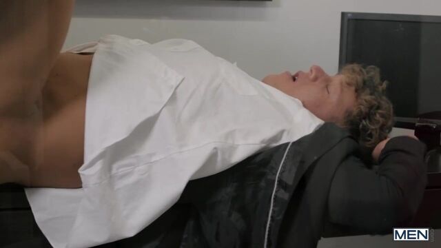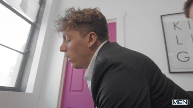 Just as Tony D'Angelo gets on the elevator, his pants fall down! One coworker quickly runs out, but horny hunk Felix Fox gives him a naughty glance as he takes in Tony's dick, then strokes it. Felix deepthroats his boss's cock, then hides on the mail cart so he can keep sucking it as Tony pushes him down the hall to his office. Tony bends the blond bottom over his desk to rim that hole, then fucks him doggystyle. Felix rides the top, then takes him in piledriver before he lies back on the desk for a hard drilling till he cums, and Tony jizzes all over the bottom's thigh.