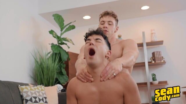 Kyle and JC just can't wait to get their hands on each other, and their cocks in each other's clothes, eagerly stripping down before JC firmly bends Kyle over the couch and rims him. "You want me to fuck that ass?" JC asks, and Kyle begs, "Tease my hole," as the top stretches him with his fingers before fucking him doggystyle. After Kyle rides him, it's his turn to top, and JC begs for Kyle's dick even harder as he pounds him in missionary. JC asks Kyle to choke him and spank his ass as the top drills him on the floor in doggystyle, then rides Kyle until he cums and takes a hot facial.