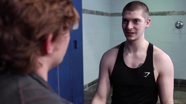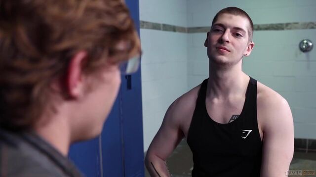 After Christian Ryder finds his stepbrother Darron Bluu's dildo in his bag, Darron admits that he's only used a toy and never tried the 'real thing'. Christian offers to let him try his 'real thing' and the two stepbrothers have hot sex in the locker room!