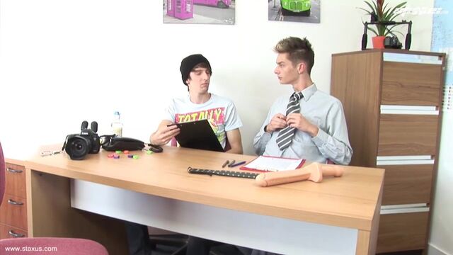 - Description: We’ve all heard of psychometric tests and workshop role-play as part of the job interview process, but things are taken to a whole new level when floppy-haired youngster, Jeanne D’Arc, is given a full-on road-test by Ethan White. Not that the new boy appears in any way flustered by the proposition – an indication, perhaps, that he’s a little more experienced than he might otherwise like us to all think. Certainly he shows no quarms when it comes to handling White’s handsome ramrod, pulling the meaty shaft from its nesting place inside the trainee’s trousers and promptly gobbling away like a pro.Nor does he show any sign of embarrassment or reluctance when White produces an array of sex-toys to use on his ass. Indeed, D’Arc takes every inch of synthetic pleasure that his fuck-buddy throws his way; and by the time that White finally gets round to using his own dick you’d be forgiven for wondering whether the bottom’s ass is too stretched to give either party pleasure. Rest assured, however, that White’s very much left the best until last as he proceeds to pound away at D’Arc’s hole in a succession of positions, culminating in the interviewee spewing a fabulous wad of hot jizz all over the bed-covers.Fuck knows who’s gonna be clearing that mess up; but neither fellow seems at all concerned, least of all White who then wanks out a fine blast of ball-snot of his own. Now if that performance doesn’t impress the judges (or indeed yourselves) then we really don’t know what will!