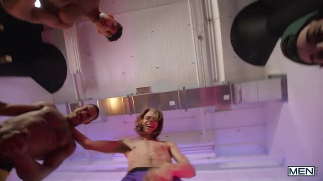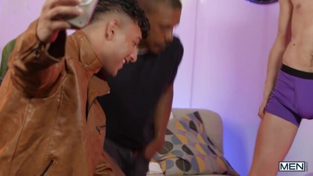 Adrian Hart put together a special game when he invites some friends over. Fellow top Kenzo Alvarez can't believe his eyes when he enters to see Theo Brady strapped down to a platform for a game of Spin the Bottom! Adrian's buddies cheer them on as they spin Theo around and he sucks first Kenzo, then Adrian's cock, and Adrian gets on the platform to lick Theo's hole, then fuck him on his back as his friends rotate them for a show from every angle! Kenzo bends Theo over the couch and pounds him doggystyle. Adrian's friends hold up the bottom's legs as Adrian drills that hole in piledriver position till he orgasms, then Theo uses the cum as lube as he rides Kenzo till he shoots his load, then takes a creampie.
