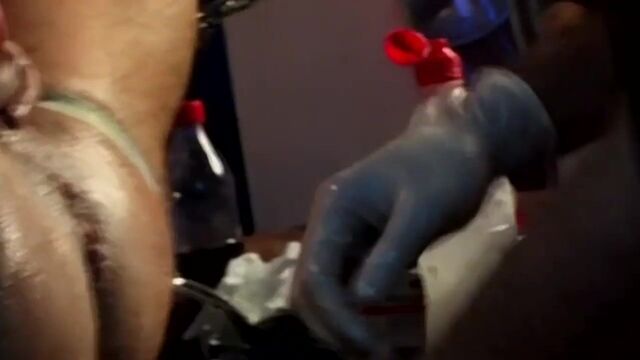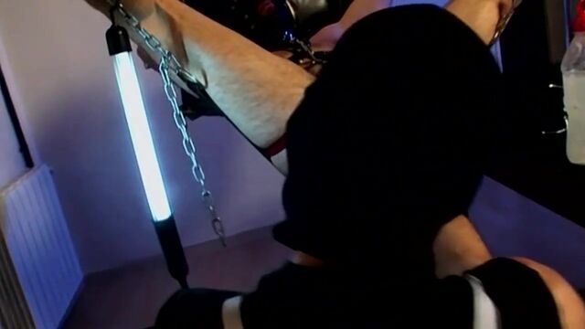He's jacking off, getting himself all worked up for his cock slave. He seeks him out in the other room, already bound and masked. The tied up slave is released and the master gets to work controlling him, getting him in the swing and inviting a friend to assist as they use his balls and dick, fist fucking his hole and making him stretch...