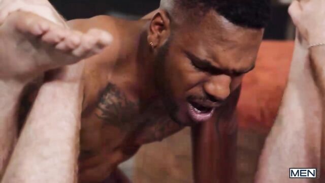 Ebony top Aaron Reese's first reaction to seeing sexy, blond, versatile Nick Fitt: "Wow!" Aaron's seen some of Nick's work, so he's excited to see what the two of them can come up with today. These guys start off slow and sensual, gradually going wild as the passion ramps up, stripping off each other's clothes and playing with each other's nipples. Nick nuzzles against Aaron's bulge, then sucks his big, black cock. Aaron returns the favor before sliding his dick into Nick's tight hole. Nick takes a deep doggystyle fuck before riding that cock. Gentlemanly Aaron makes sure Nick cums first before pulling out and blowing his load all over him!