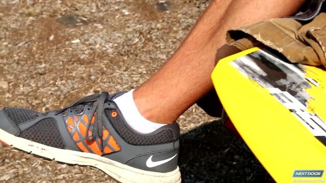 Luke Adams is an exuberant body builder from San Diego with a great attitude and a tight package. Showing off his guns, this gymnast turned weight lifter takes a break from his hectic schedule for our cameras, revealing his multiple piercings and his rock hard cock. Reclining on an ATV in the mid-day sun, he pulls off his shorts and peels out of his undies, unleashing his eager cock, as he spits into his palm and fingers its head while it gets harder and harder. In need of a cool-off, Luke makes his way to a water spigot, drenching his rippled chest and basking in the relief of the cool water, before returning to the ATV to get down to serious business. He grabs his cock with both hands and strokes himself into climax, drizzling himself with a glazed load that puddles on his chest and glistens in the outdoor heat. Enjoy!