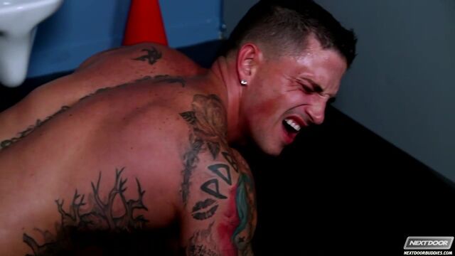Johnny Torque is minding his business in the bathroom stall, contemplating what to do with his afternoon when all of a sudden he hears the footsteps of someone approaching. Slate Steele is no stranger to the routine, and he spies through the glory hole to see if the stall is occupied. Seeing Johnny's cock getting hard through the hole, Slate drops to his knees to get a better look. Johnny can feel Slate watching him, and the thought of a stranger eyeing him turns Johnny on, so as his cock grows in his hand, he decides to do something about it, standing up to shove his cock through the hole where Slate is waiting with his mouth wide open. Slate nibbles on Johnny's head as Johnny emits a soft groan of pleasure, which turns to a full on ecstatic gasp as Slate deep-throats the full shaft of Johnny's member. Johnny comes out of the stall and they meet face to face. Not at all displeased to meet this new stranger, Johnny drops to his knees and returns the favor as Slate leans back against the stall. Slate's cock grows and gets rock hard, but it's his ass that is really in need of service, and sensing this, Johnny bends him up against the stall and enters from behind, as Slate closes his eyes and eases it in. Johnny grabs Slate by his shoulders and begins to pound relentlessly as his balls slap up against Slate, and he soon pushes Slate onto the ground, continuing to thrust and pump as Slate strokes his load all over the floor, before Johnny pulls out and blasts him with a load of his own.Enjoy!