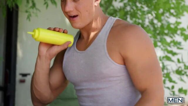 Eager beaver Felix Fox's promptness backfires when he and his bf Joey Mills show up early to the cookout and find themselves at the mercy of a very stressed hostess. Felix offers Joey a sneaky bj to apologize, squirting mustard on his sausage and licking it off! Joey sucks Felix behind the grill, but when he's called away, Felix sneaks into the kitchen to stick his dick in a pie instead. Luckily, Joey comes in to pick up where he left off, deepthroating the blond hunk and bending over the counter to get fucked. Felix pounds the bottom missionary on the counter, then Joey rides the top till he cums before getting a little pre-cookout snack on his face.