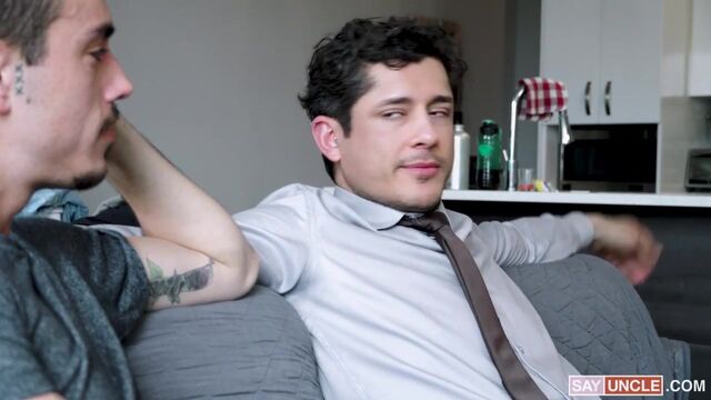 Rocky is talking with his stepson Sean when he tells him that he’s preparing for a job interview, so Rocky asks Sean to show him what he’s going to wear. While Rocky helps Sean put on a tie, Sean can feel his stepdad’s boner behind him and now he can’t help himself but jump on stepdaddy’s cock!