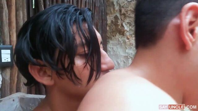 Boyfriends Lucca and Ragel have just finished a Mayan ritual, and are now exploring the beautiful cenotes of Cancun. When they come across Marco, Ragel quickly follows him to see if he could take a picture of the couple. Marco decides to rinse off in an outdoor shower first, and Ragel is quick to join him.