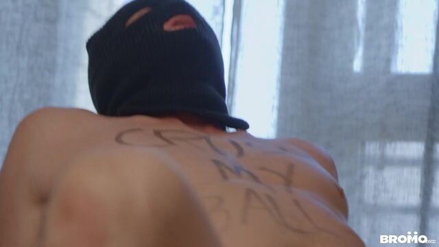 Edward Terrant finds a masked Pierce Paris waiting, naked, with one clear instruction: "Crush my balls." Edward gets straight to work, slapping and stepping on Pierce's low-hanging nuts, and even sliding them into the bottom's eager hole! The top makes sure to give the sub's balls a squeeze as he pounds him in doggystyle and piledriver, then cums all over Pierce's ski mask before giving those plums one last kick.