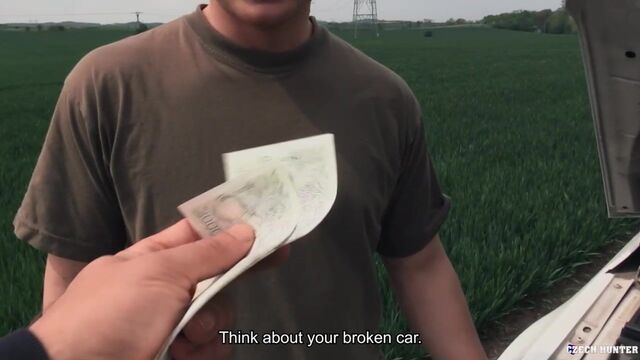 This young man wanted to have his own car. He was a bit impatient and spent his entire savings on the first decent looking vehicle he was able to afford. I met the poor dude when he was hitchhiking next to his broken-down wheels. I couldn't help him fix it, but I certainly could make a contribution to his repair fund. He was a bit surprised and worried about the cars passing by but eventually agreed to experiment a little. Nothing serious, just a little blowjob behind his car. It wasn't exactly comfortable, so we soon moved off the busy road. Hidden behind trees, the guy showed his true greed. I promised him all my cash... sliding my horny cock in his virgin ass was all I asked for in return. My new friend wanted his precious car fixed badly, he just leaned against a tree and let me fuck him.