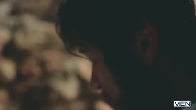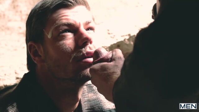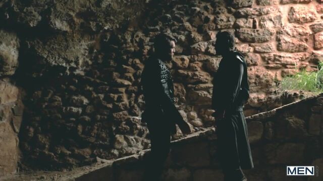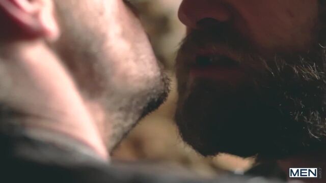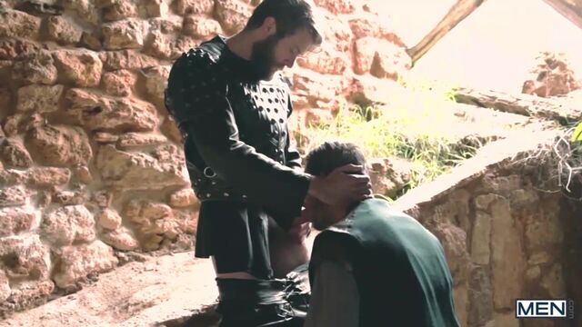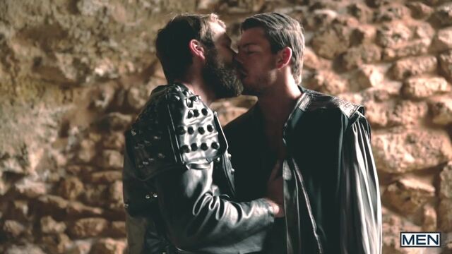 After a long and bitter battle, Colby Keller returns to a captured city with his lord, Toby Dutch. The two sandy-haired men survey the conquered lands before Colby claims his reward by passionately kissing Toby in the ruins. The bearded Colby undoes his lord’s pants and intimately kisses and sucks his uncut cock, getting it hard in his warm mouth with a long and tender blowjob. Toby retruns the favour, taking Colby’s cock deep in his throat as their breath curls in the cold air. Snow begins to fall as Colby bends Toby over and fucks him, the sound of soldiers marching rising and falling around them. The two men fuck until they’re ready to shoot their hot loads over the cold battlefield, Colby covering Toby’s face with a thick blast before Toby shoots his all over Colby’s thigh.